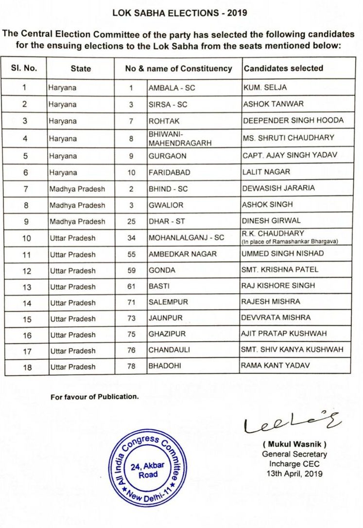 लोकसभा चुनाव: कांग्रेस ने 18 उम्मीदवारों की एक और लिस्ट जारी की.